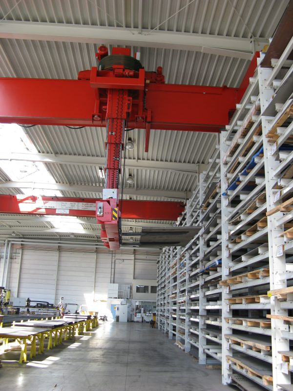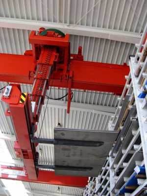 Der Stapelkran, der auch als „normaler Kran“ eingesetzt werden kann, zeichnet sich durch ruhigen Lastentransport und hohe Übersichtlichkeit von Last- und Transportweg aus. Start und Ziel des innerbetrieblichen Lastentransportes können mit der Funkfern- oder Kabinensteuerung rasch und genau erreicht werden.