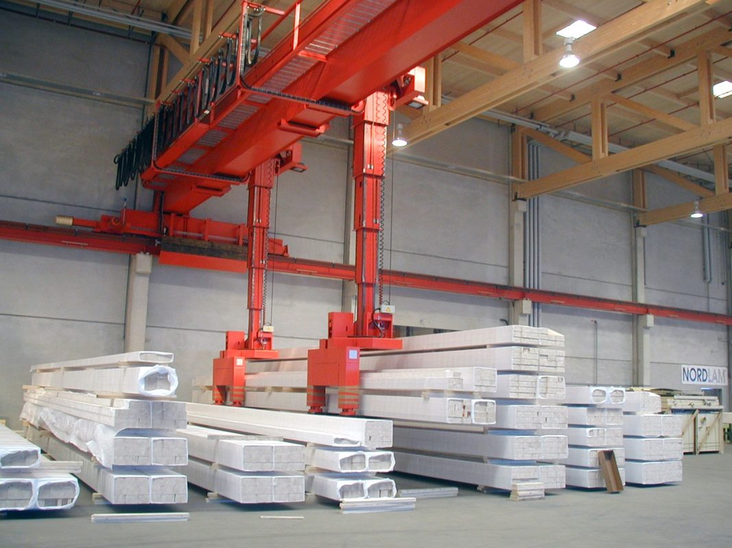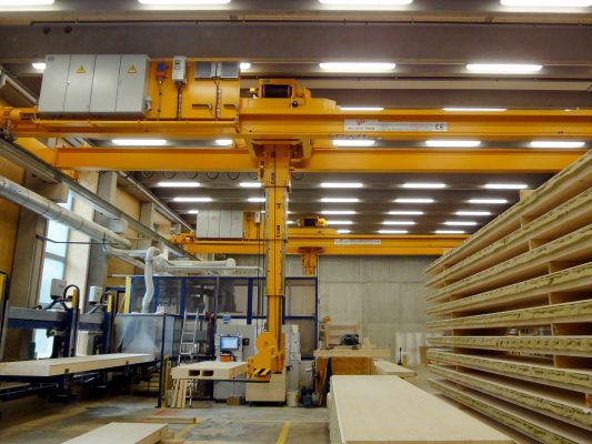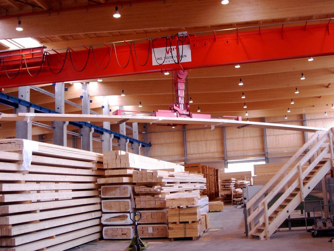 Gerade in der Holzindustrie mit ihren zum Teil langen Produkten (Längen bis zu 20 m) ergibt sich für den Stapelkran ein spezielles Einsatzgebiet. Beim Hantieren von solchen sperrigen Gütern kommen die herkömmlich verwendeten Stapler (Front- oder Seitenstapler) an ihre Grenzen. Speziell wenn es um Drehen oder Verladen geht, ist hier der Einsatz von unseren Stapelkränen von höchstem Vorteil. Tragfähigkeiten bis 13t und Bewegung des Gehänges in alle Richtungen ermöglichen ein flexibles Arbeiten.