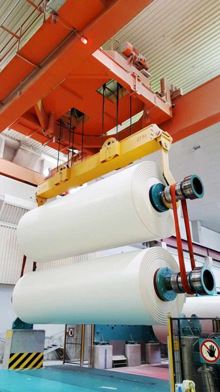 Tambourkräne sind prozessoptimierte Kräne, die mit hoher Zuverlässigkeit die Produktions- und Lagerprozesse in der Papierindustrie unterstützen. Neben den besonderen Anforderungen im Nassbereich mit hoher Feuchte und Temperatur sind dabei vor allem Präzision beim Wechsel der Tamboure sowie teil- oder vollautomatisierte Prozesse mit hohen Hub- und Fahrgeschwindigkeiten für effiziente Ein- und Auslagerung gefragt.